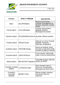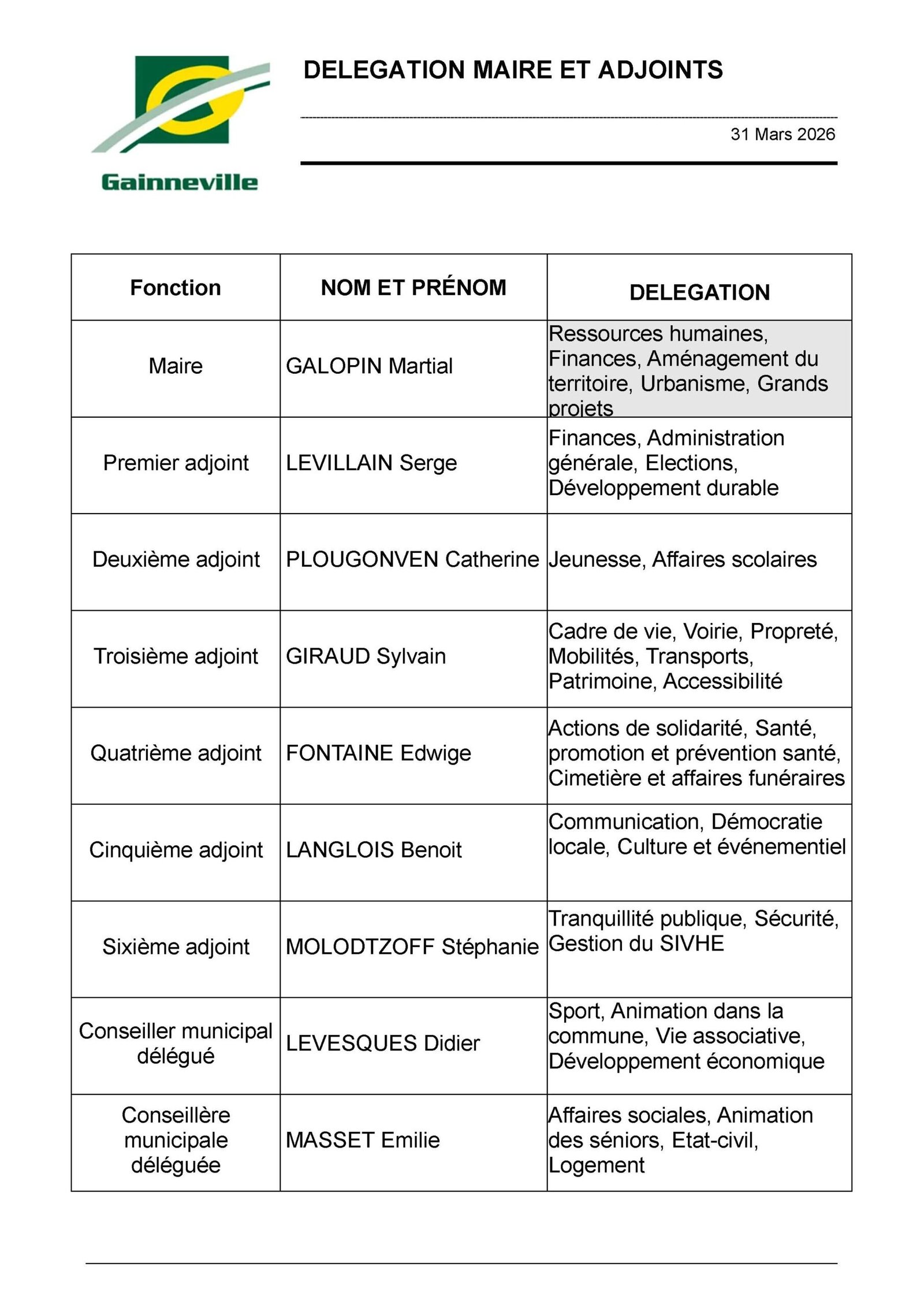 ActualitésDélégations des élus Délégations du Maire, des adjoints et des conseillers délégués. Suite à son élection, Monsieur Galopin a procédé à l’attribution des délégations par arrêtés : Remerciements de M.Galopin