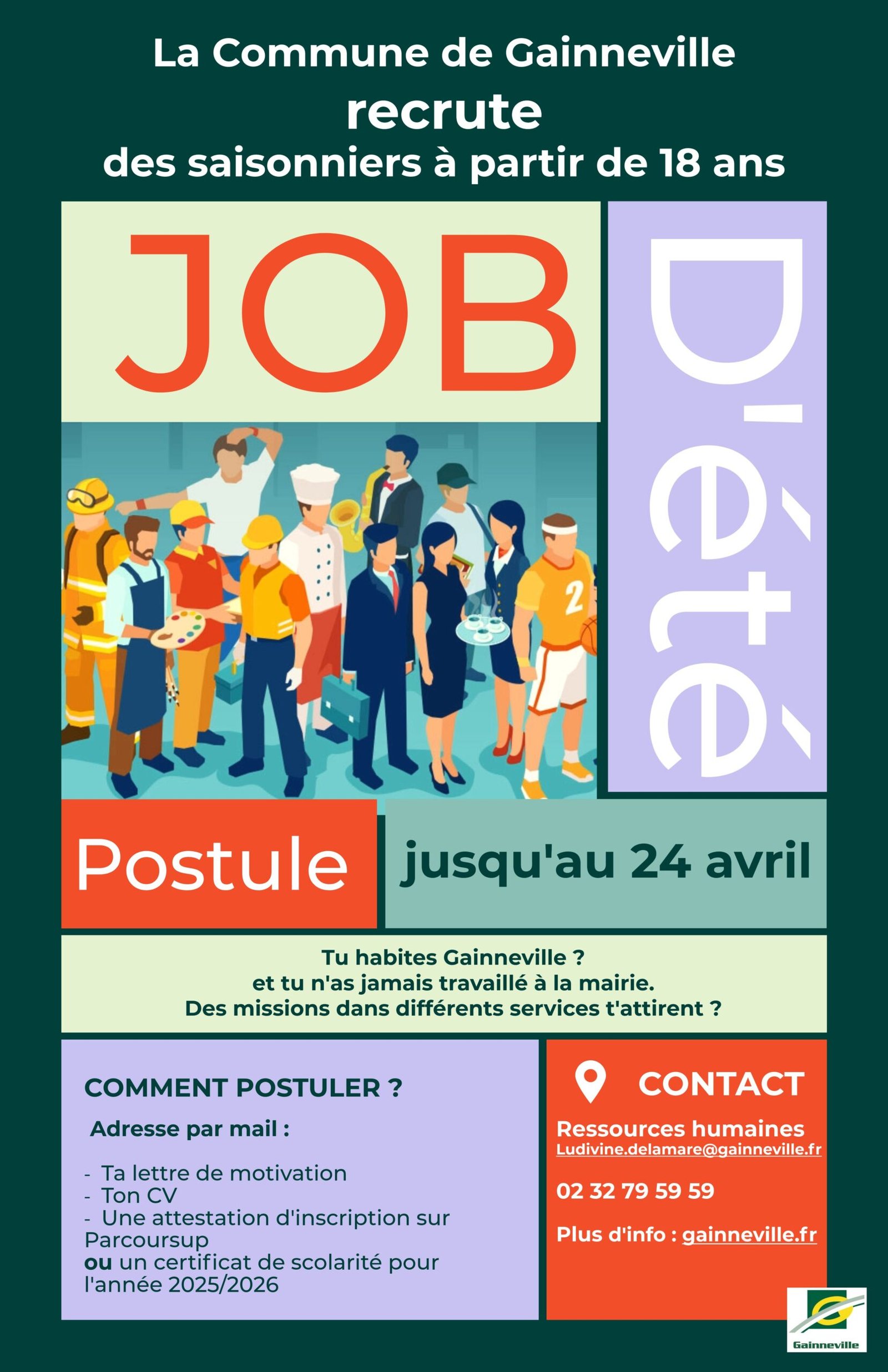 • Tu habites à Gainneville, tu as au moins 18 ans et tu es toujours scolarisé ? Alors n’hésite-pas à postuler à la mairie pour un emploi saisonnier au sein des services municipaux.